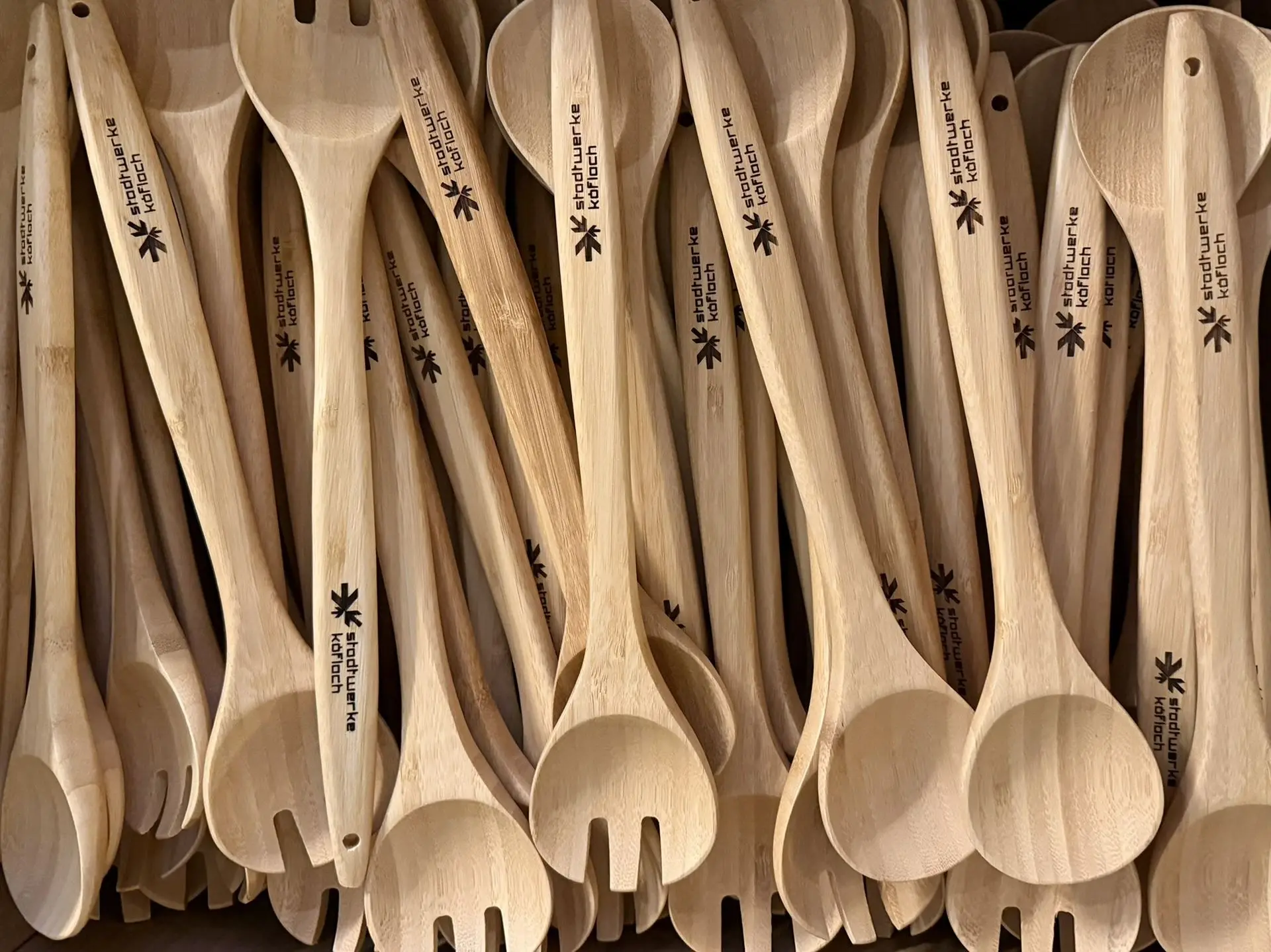 Für die Stadtwerke Köflach durften wir ein hochwertiges Holz-Salatbesteck (Löffel & Gabel) als Mitarbeitergeschenk umsetzen. Insgesamt wurden 100 Sets gefertigt und mit dem Logo dezent auf den Griffen veredelt – praktisch, langlebig und perfekt für den Alltag.